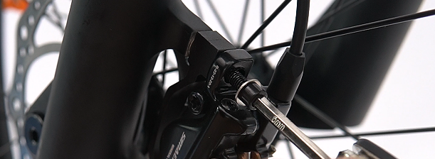 Step 11: Squeeze the left front brake lever tightly and tighten the screws on the top and bottom of the brake caliper. Release the brake lever to ensure that the brake rotor is centered between the brake caliper pads.