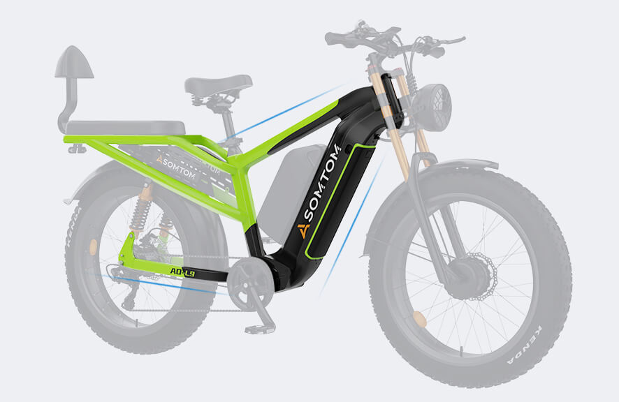 The L9’s dual-side air rear shock delivers a customizable and ultra-smooth ride across unpredictable terrain. Designed to absorb harsh bumps and vibrations, it improves comfort, traction, and control — whether you're riding loaded or light. With adjustable air pressure tuning, this suspension system adapts to your weight, speed, and style, giving you the confidence to ride harder and farther.