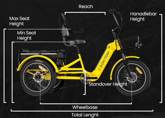 Frame SizeHeightReachWheelbaseMin Seat HeightMax Seat HeightTotal LengthHandlebar HeightStandover HeightSize5'2" - 6'3"33.5"55.1"29.1"36.2"74.8"45.7"14.1"