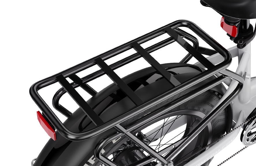 The rear rack is a practical addition, designed for carrying essentials. Whether it's daily commutes or longer journeys, it provides dependable storage solutions, making it easier for riders to transport items securely and conveniently.