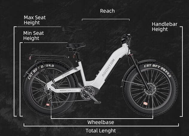 Frame SizeHeightReachWheelbaseMin Seat HeightMax Seat HeightTotal LengthHandlebar HeightSize5'2" - 6'8"27.17"48.43"34.25"42.13"75.59"40.94"