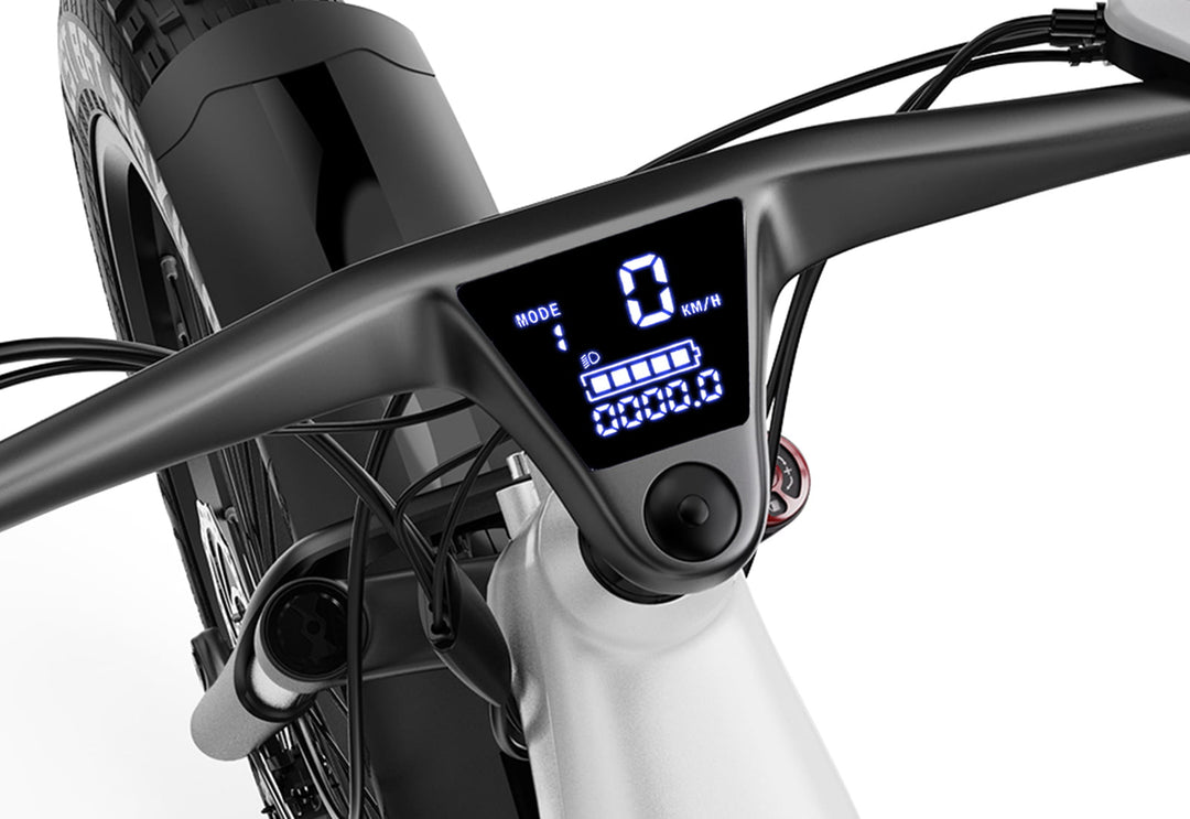 Handlebar showcases a clear display and adaptable front light. The screen reflects vital stats like speed and battery, and the light switches between beams.