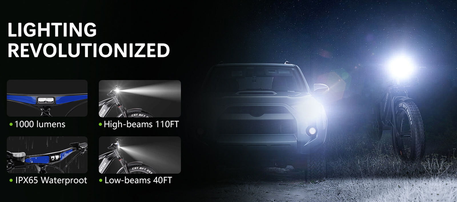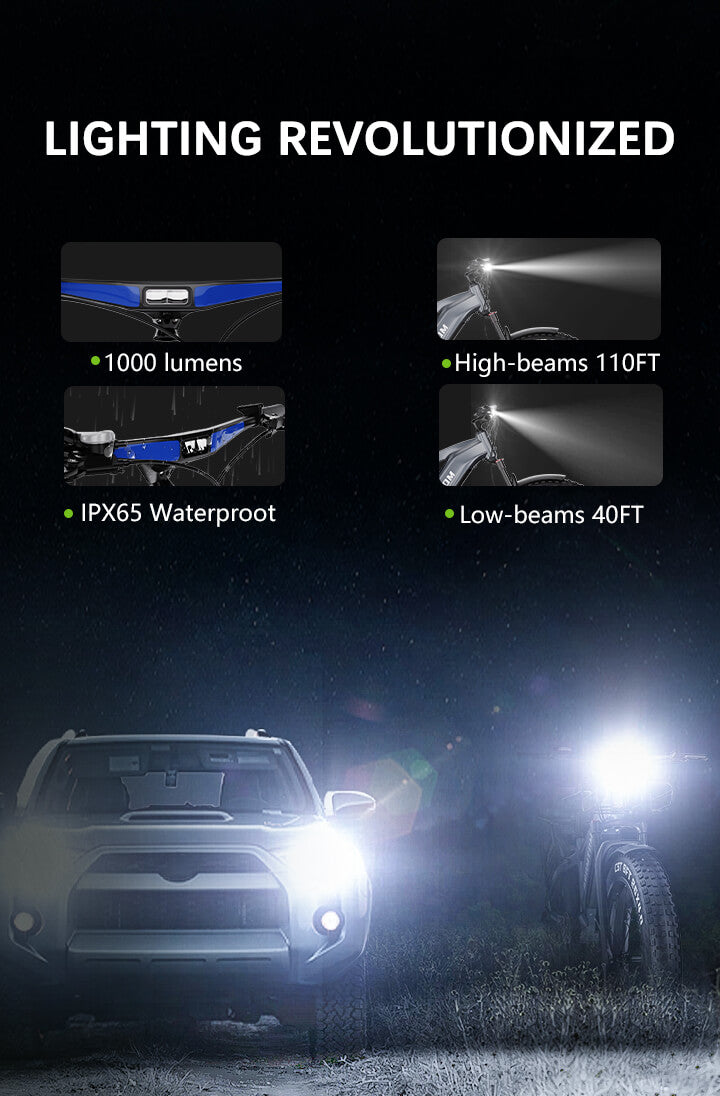 Tires26" x 4.0" tiresLightsPowerful High and Low BeamBrakeHydraulic Disc BrakeFront ForkHydraulic Suspension