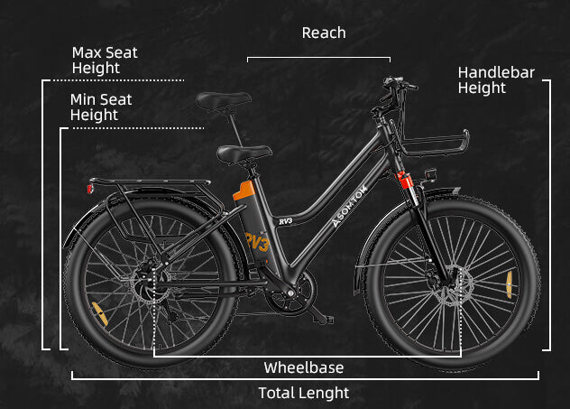 Frame SizeHeightReachWheelbaseMin Seat HeightMax Seat HeightTotal LengthHandlebar HeightSize5'2" - 6'3"25.20"44.88"33.46"40.94"71.26"42.13"