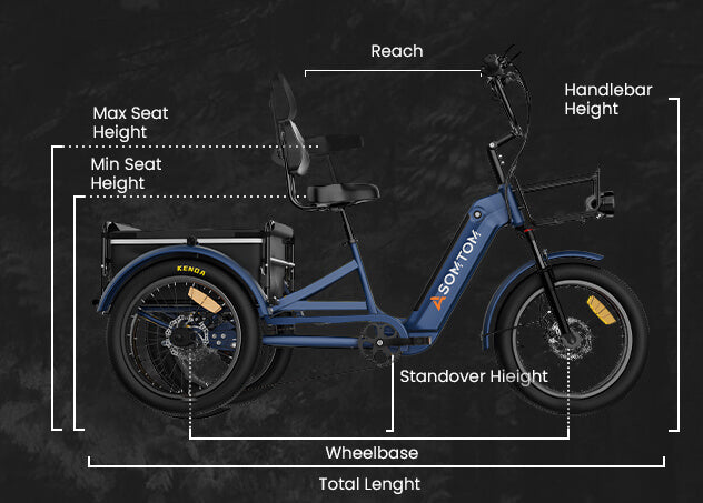 Frame SizeHeightReachWheelbaseMin Seat HeightMax Seat HeightTotal LengthHandlebar HeightStandover HieightSize5'2" - 6'3"33.5"55.1"29.1"36.2"74.8"45.7"14.1"