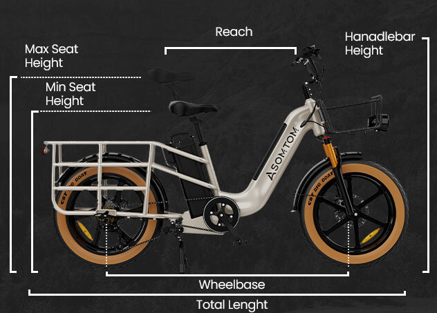 Frame SizeHeightReachWheelbaseMin Seat HeightMax Seat HeightTotal LengthHandlebar HeightSize5'2" - 6'3"25.59"50.79"31.11"36.61"70.86"46.85"